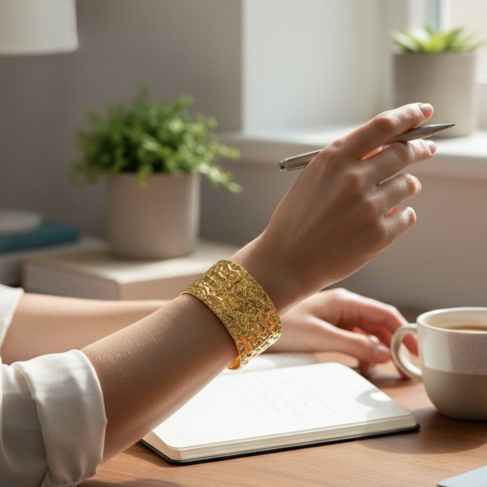 Un Consiglio per mantenere il bracciale rigido dorato martellato è di conservalo in un luogo asciutto  lontano dall’umidità per evitare macchie o opacità . Puliscilo periodicamente con acqua tiepida e sapone neutro, asciugandolo con un panno morbido per mantenere la brillantezza.