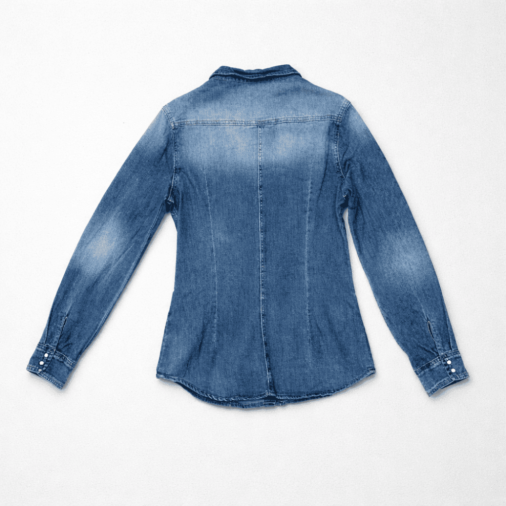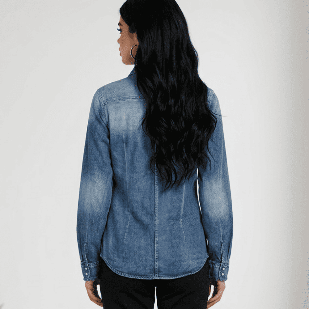 La camicia jeans vintage casual è ideale da indossare da sola o come giacca leggera  sopra una t-shirt e top, si abbina facilmente sia a pantaloni in denim che a gonne o pantaloni in tessuti più eleganti, per creare contrasti di stile dinamici e contemporanei.