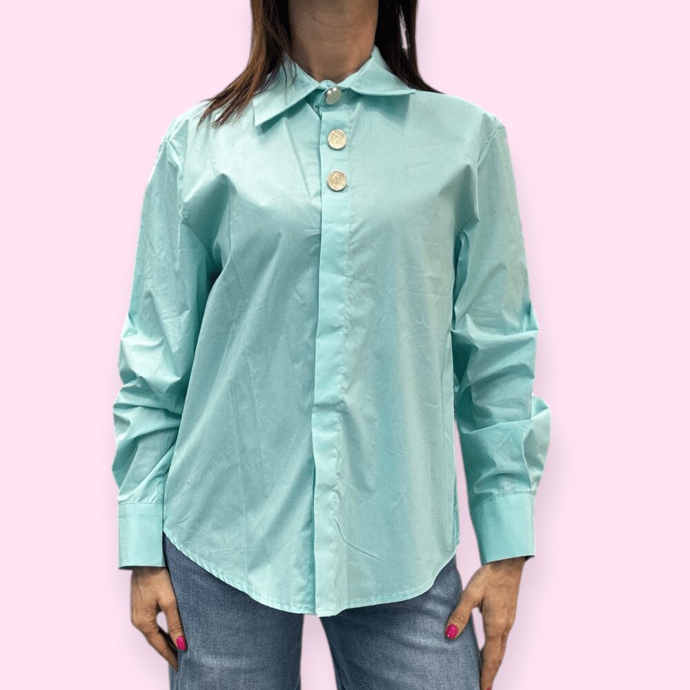 Il modello è caratterizzato da maniche lunghe e colletto. Arricchito da tre bottoni di dimensione più grande color oro.