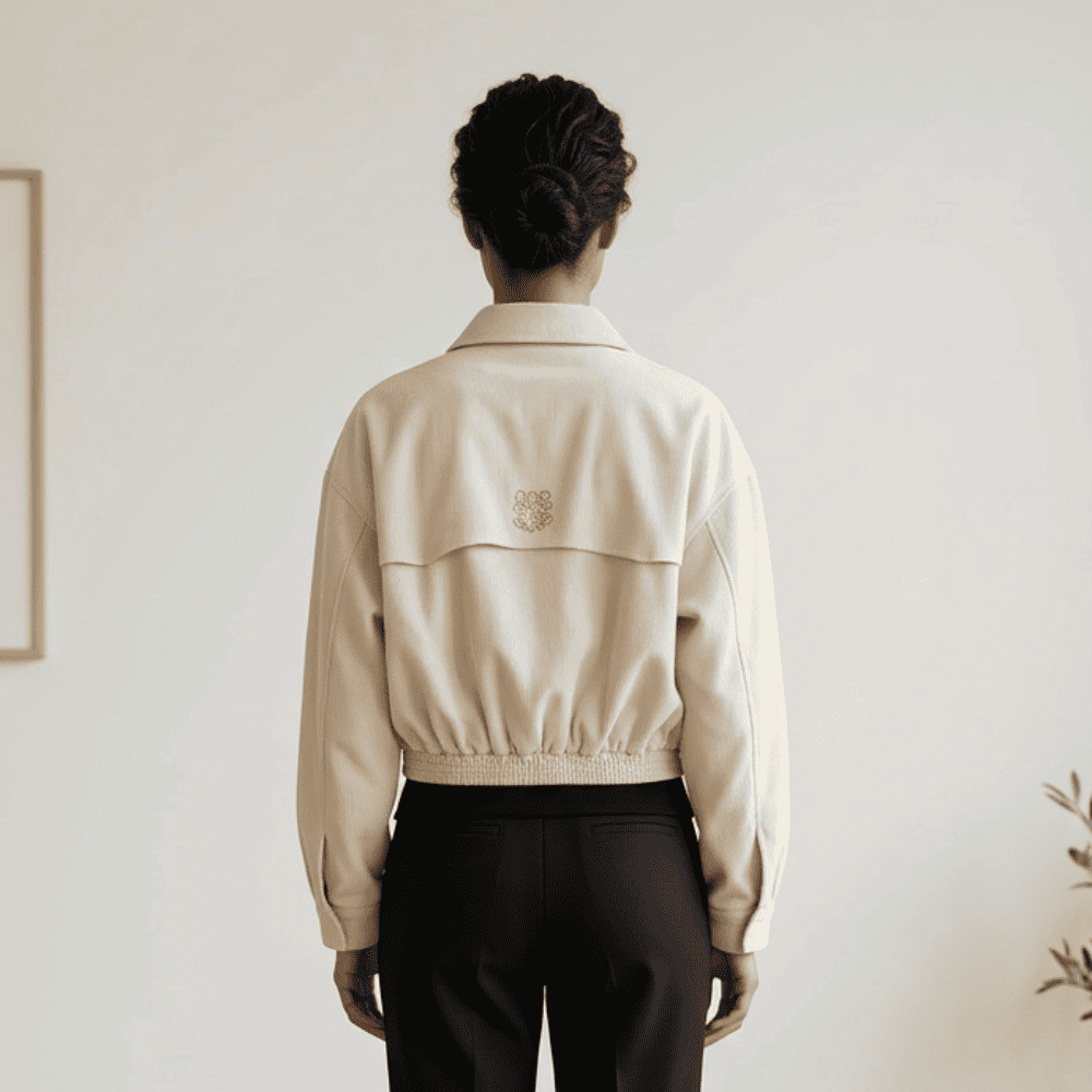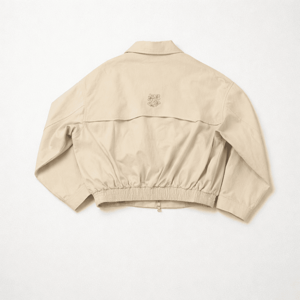 Il giacchetto bomber corto beige presenta sul retro un piccolo ricamo dorato centrale, che aggiunge un tocco decorativo minimalista.