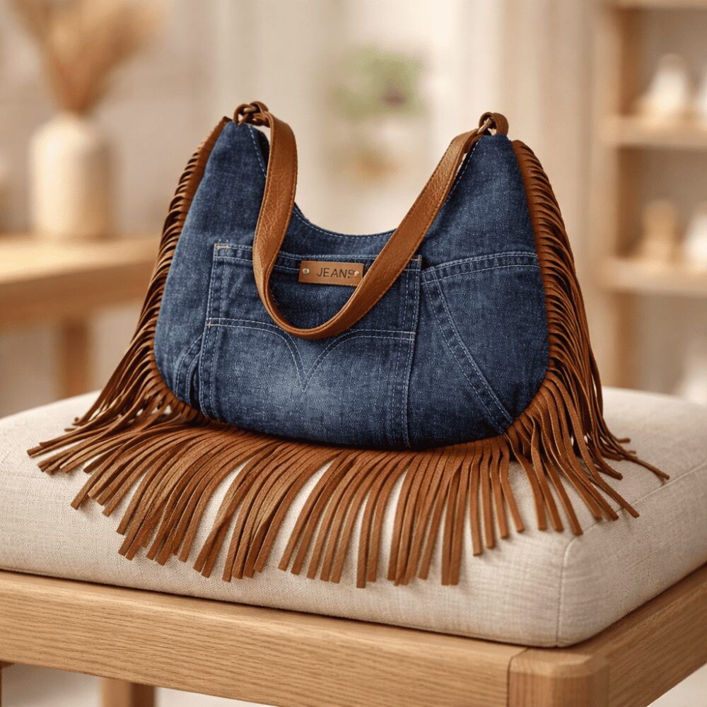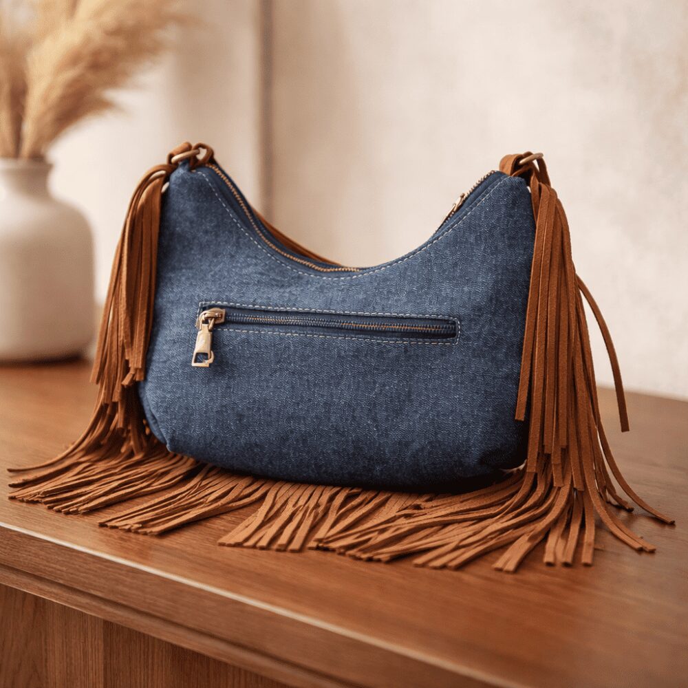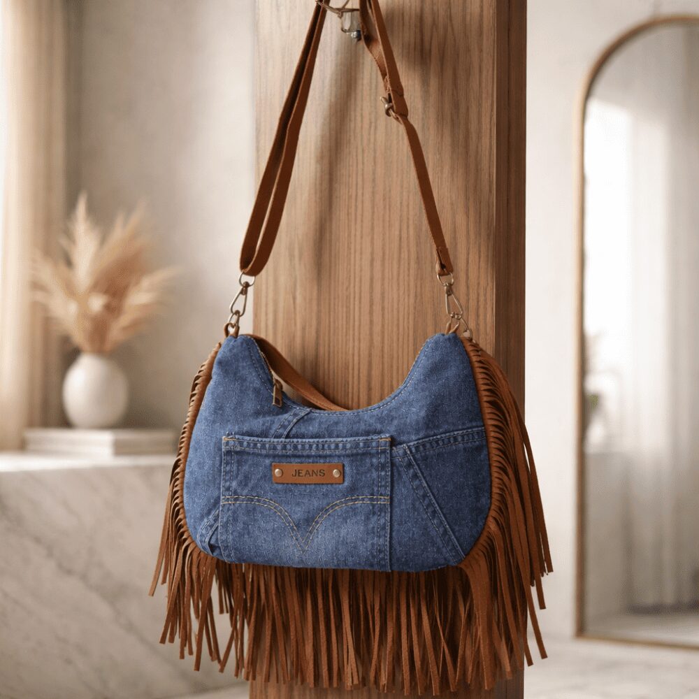 Il modello è caratterizzato da un design distintivo che unisce carattere a utilità ed  è perfetta per chi ama accessori originali ma versatili. La parte frontale è valorizzata da una tasca applicata con cuciture a vista e una piccola targhetta decorativa che richiama l’ispirazione jeans, enfatizzando il look contemporaneo e informale. I bordi della borsa sono impreziositi da lunghe frange che creano movimento e personalità rendendola un accessorio perfetto per completare outfit boho, urban o casual.