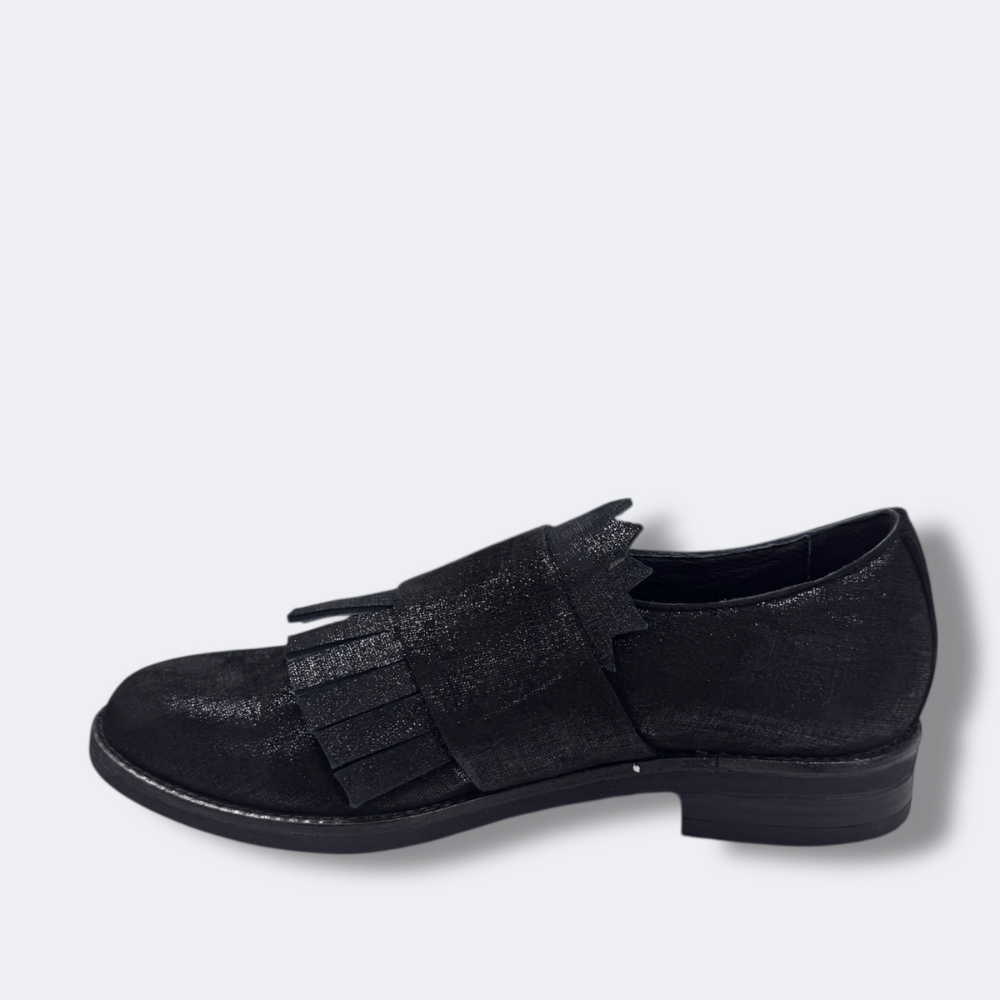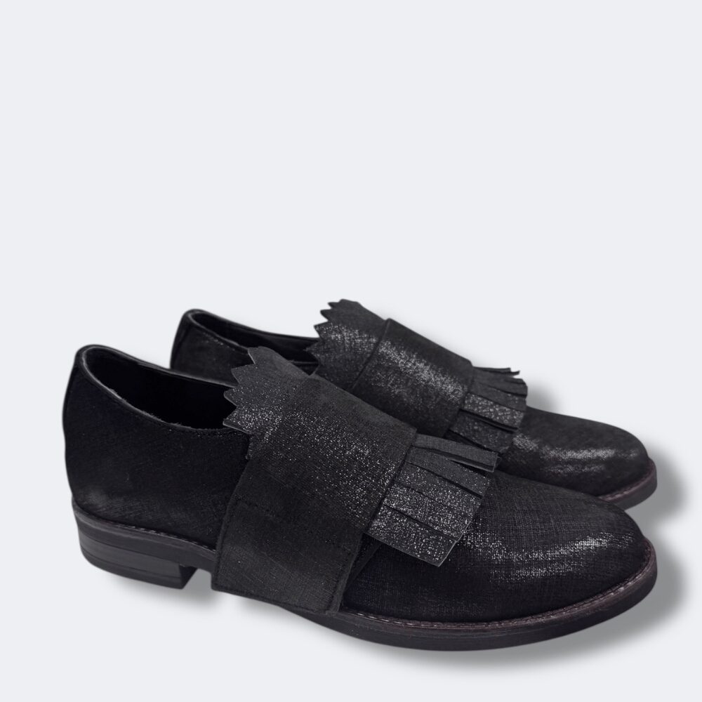 l mocassino nero frange elegante è realizzato in morbidissima pelle effetto glitterato.