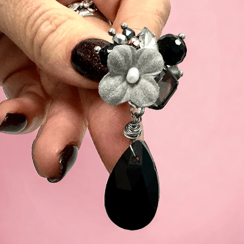 Il modello è caratterizzato da ciondolo a forma di goccia, arricchito da perline e strass di diversi colori e dimensioni. Chiusura con farfallina.