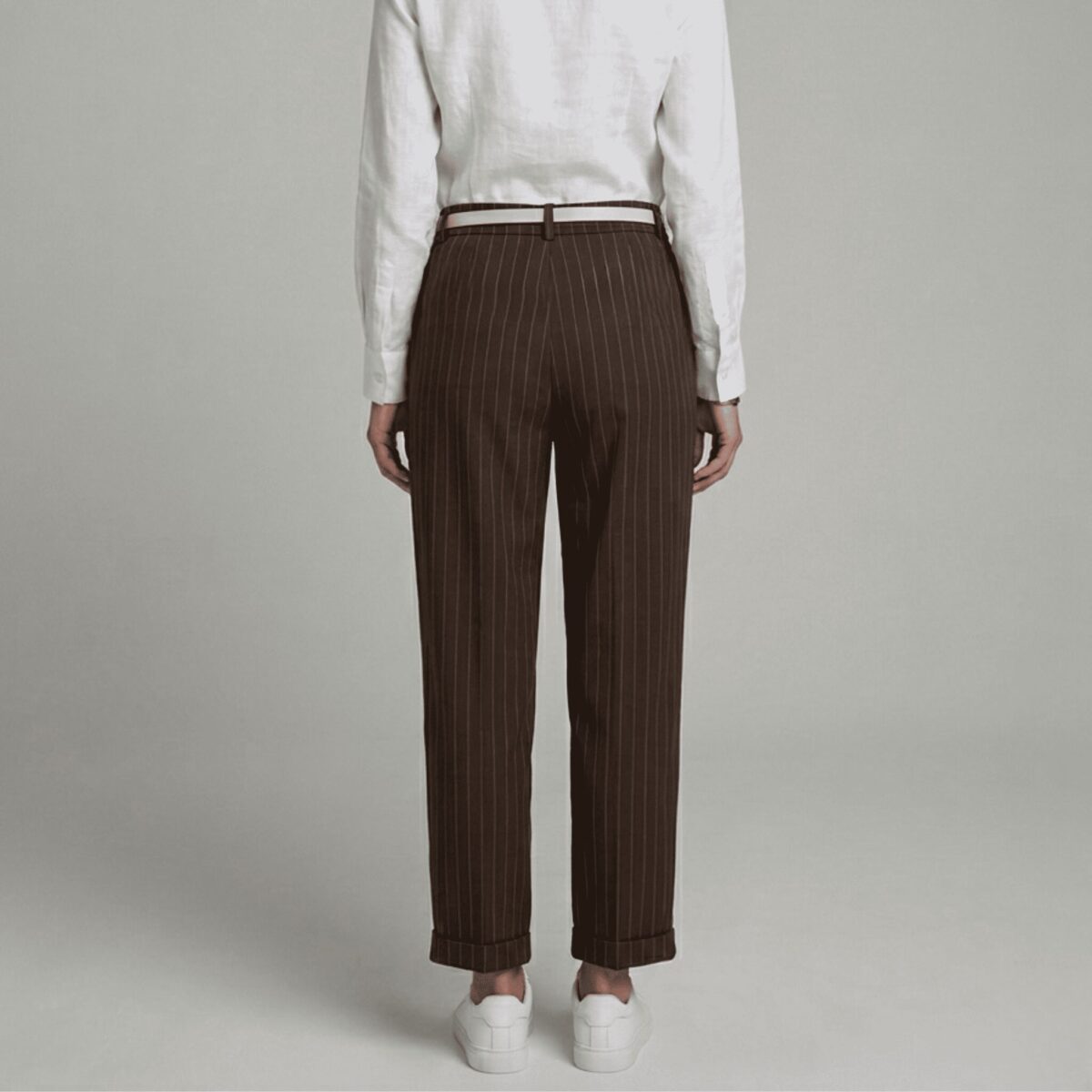 I pantaloni marroni gessati cintura sono dotati di un inserto elastico posteriore che garantisce una vestibilità impeccabile per diverse silhouette. Il capo è impreziosito da una cintura sottile inclusa, in tonalità crema .  Abbinabili con una camicia bianca e con la sua giacca coordinata per un outfit professionale impeccabile, mentre per un look casual indossali con un pullover leggero color panna e delle sneakers bianche.