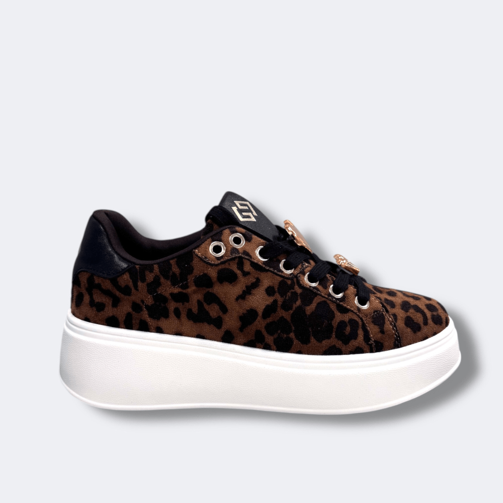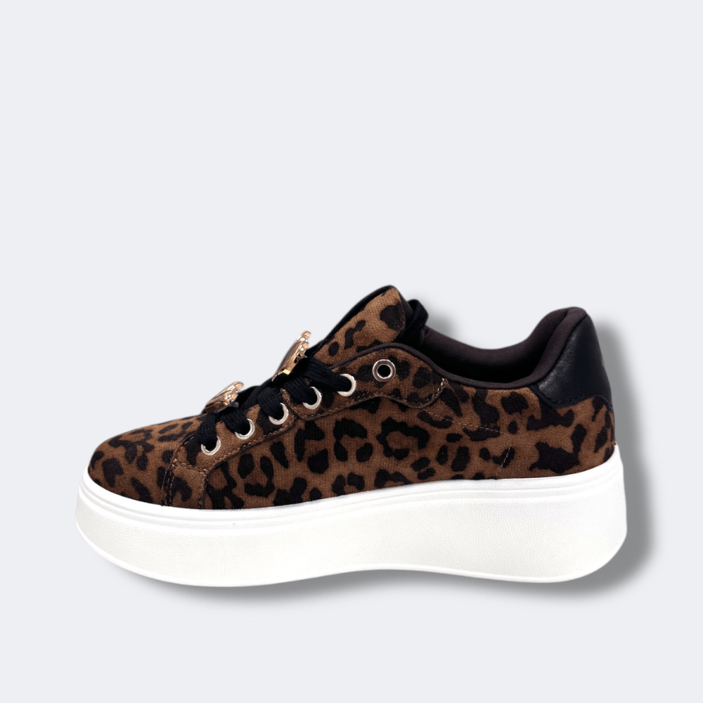Il modello è caratterizzato da stampa leopardata in toni marroni e neri, con lacci neri impreziositi da charm rimovibili dorati a forma di cuore