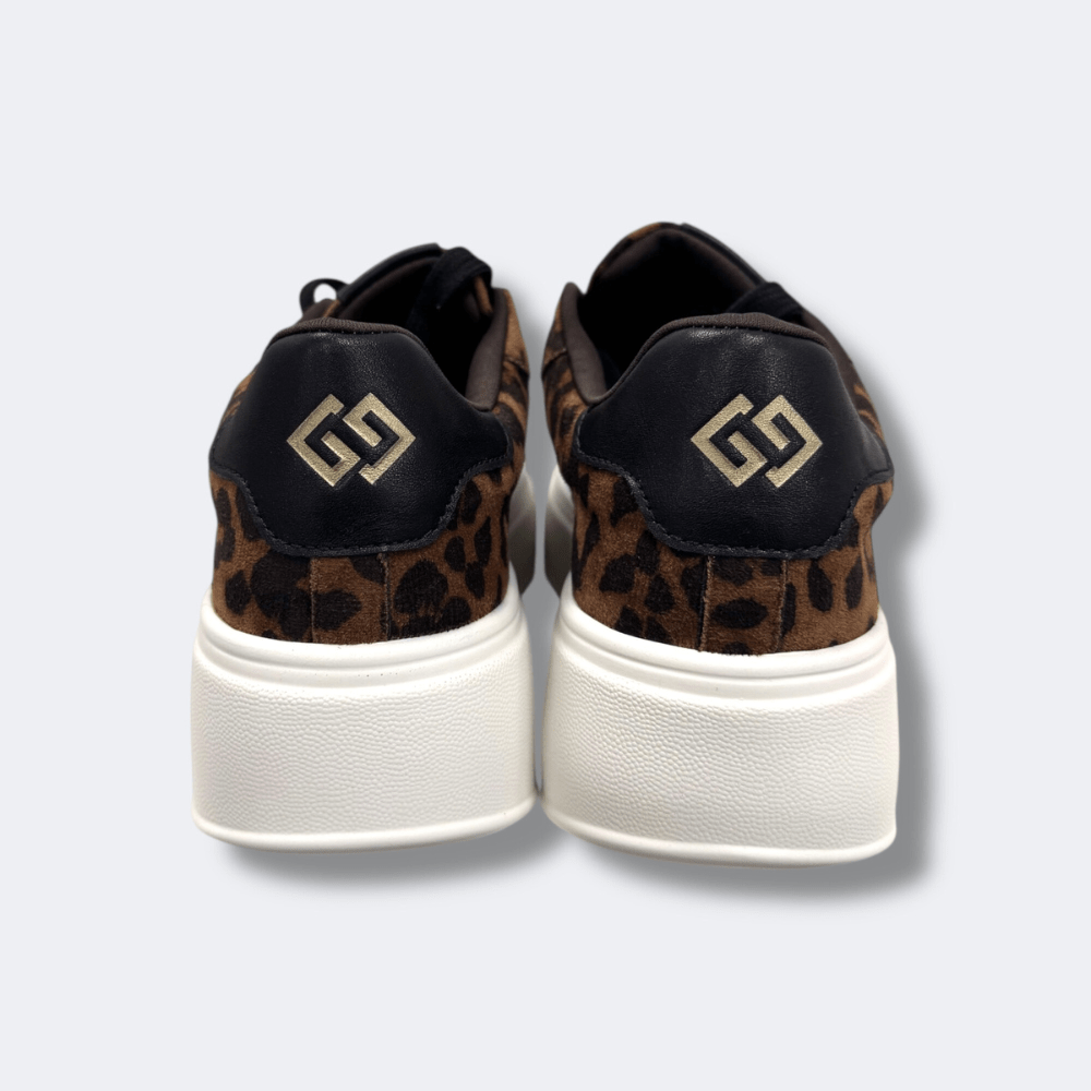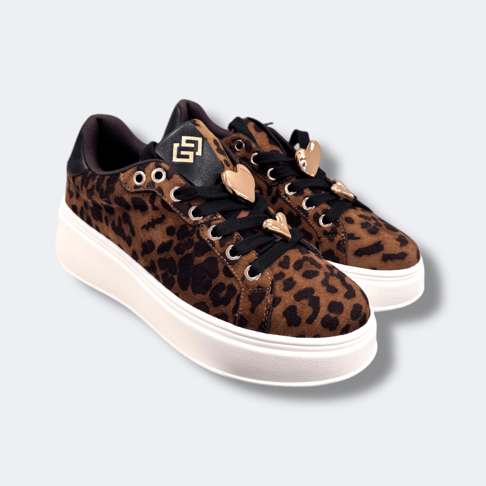Le sneakers leopardate cuori dorati hanno la linguetta con logo geometrico dorato, e la suola bianca alta, dona un contrasto moderno e sportivo