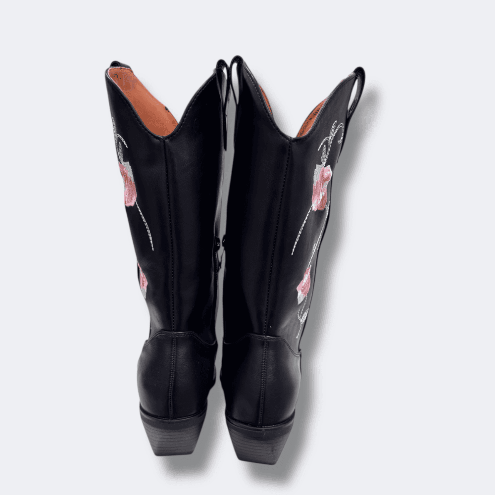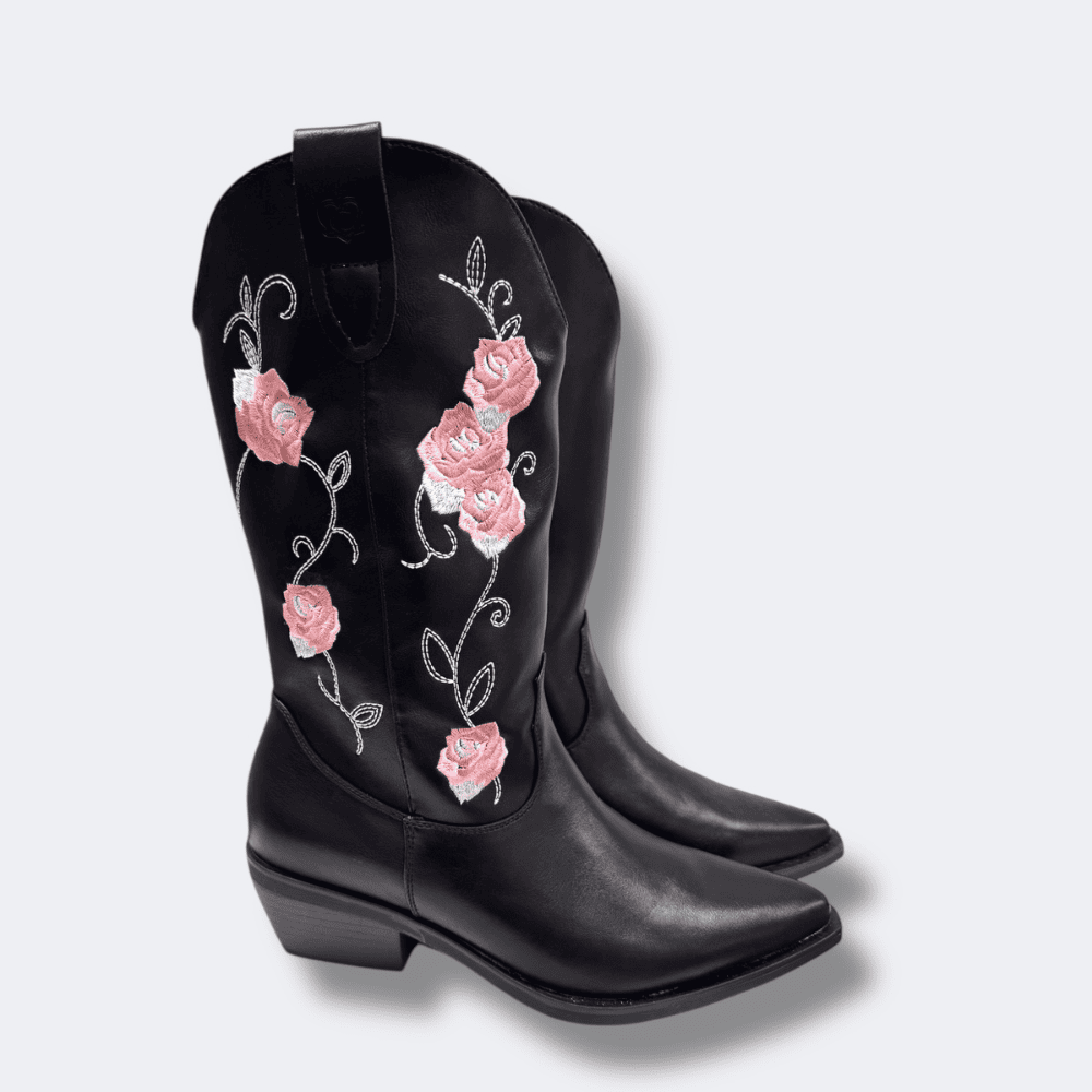 Il modello è caratterizzato da un design elegante e dettagli curati. La tomaia liscia è impreziosita da rose rosa e foglie bianche ricamate solo sul lato esterno , creando un contrasto raffinato con il  fondo scuro. La punta affusolata  e il tacco inclinato basso conferiscono il tipico stile western, rendendolo ideale sia per look casual che per outfit più ricercati.