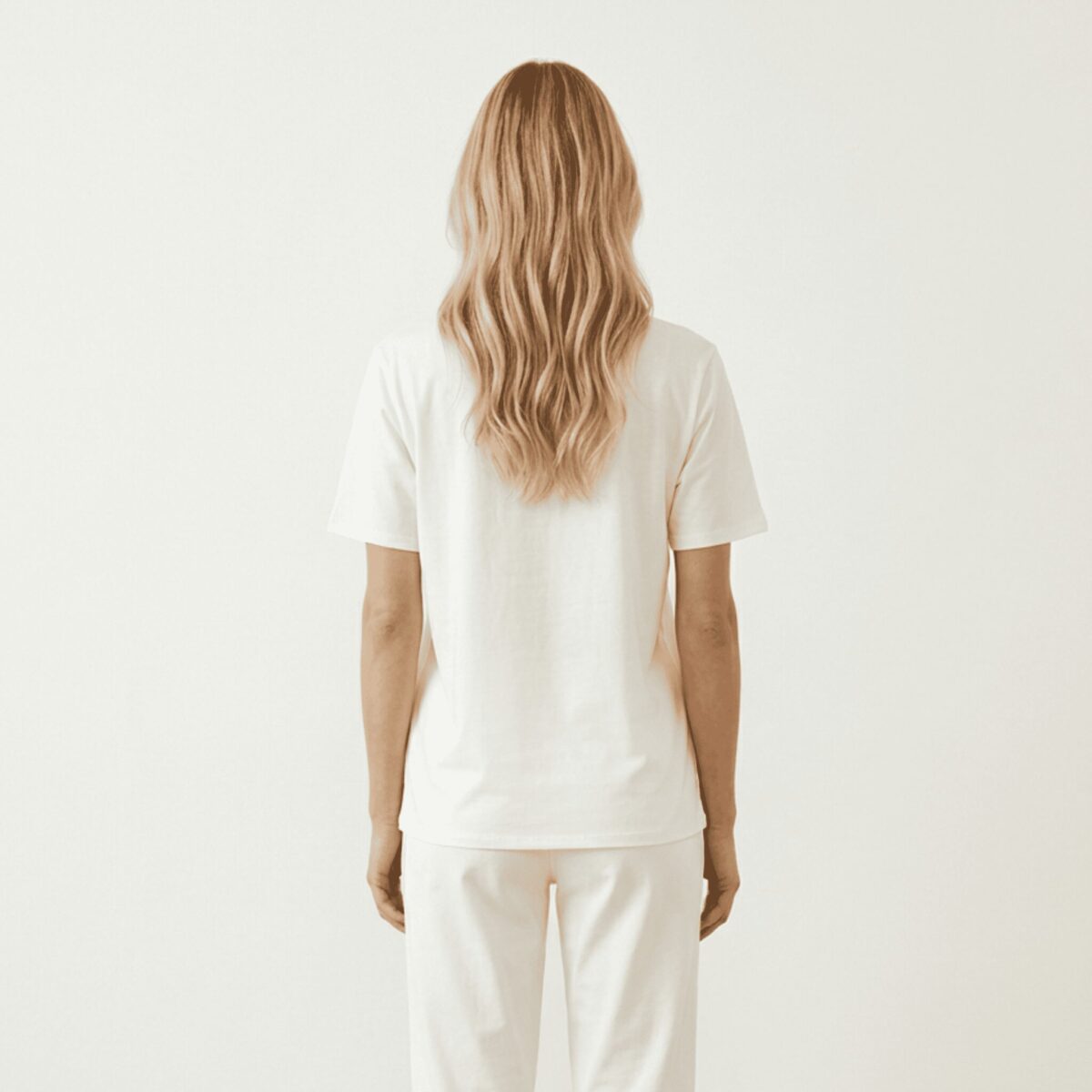 Il modello è caratterizzato da maniche corte e da un design minimalista con una stampa testuale ironica sul lato sinistro del petto. La scritta “odio tutti” è realizzata in caratteri rossi semplici, accompagnata da un piccolo cuore rosso che crea un contrasto tra il messaggio apparentemente negativo un dettaglio visivo più leggero e affettuoso. Il tessuto è morbido e leggero, adatto a un look casual quotidiano.