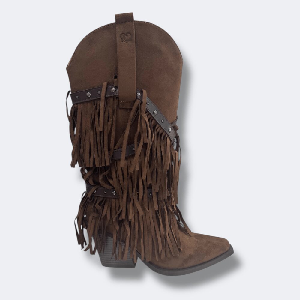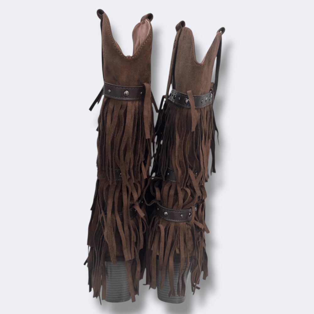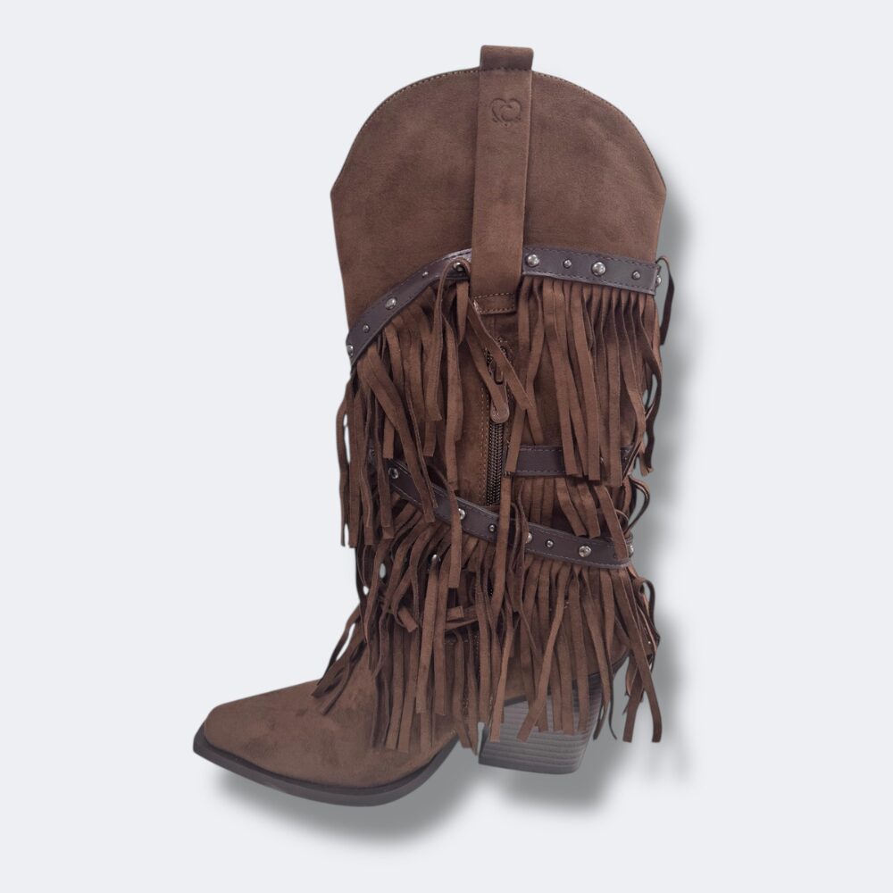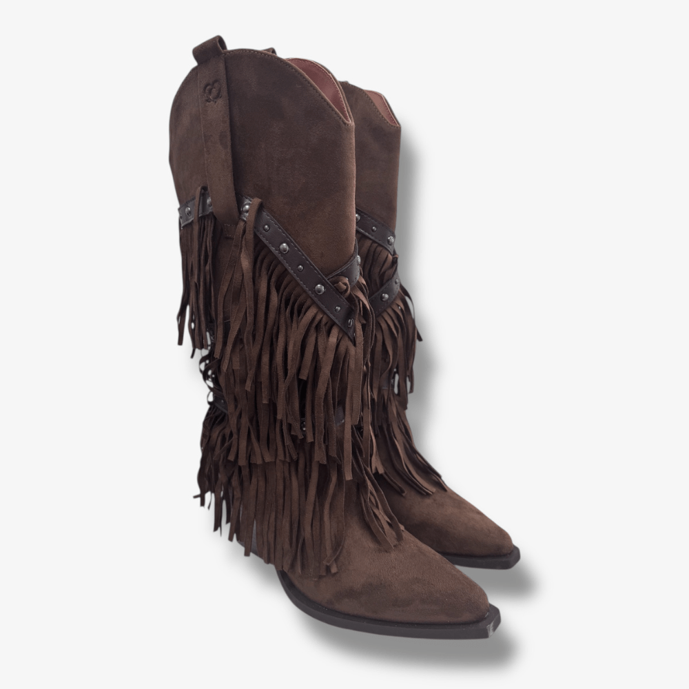 Il texano frange marrone è realizzato in morbida texture effetto camoscio.